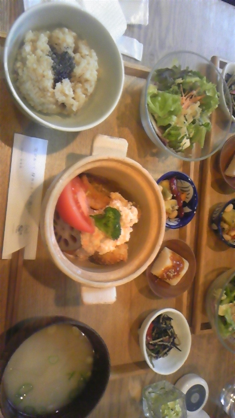 若い女性が列ぶ訳ですね。色々と少しづつヘルシーな小鉢が並んでます。メインはサケのフライです。お味もグッドです。