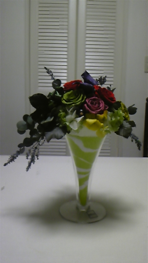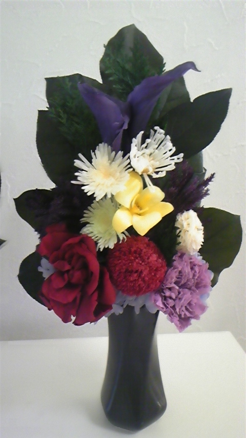 お一人の方は東大寺の裏にお住まいで、大仏様と同じお姿の小さい仏像(300年程前から伝わっているものらしい)の両脇に置かれると言う事でした。個性的な仏花を希望でしたので粋な雰囲気を配色デザインしてみました。想像するだけでも素敵な感じがわかるような~(^_^) オシャレな仏様になって喜んでくださることでしょうp(^^)q