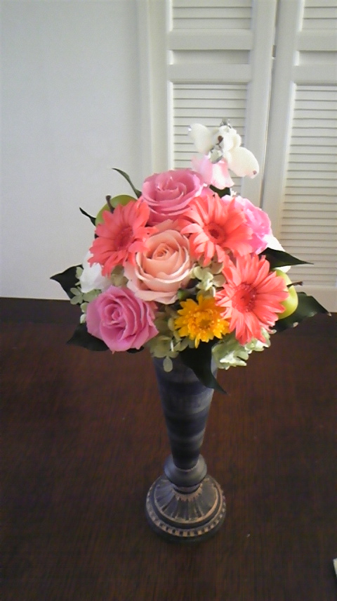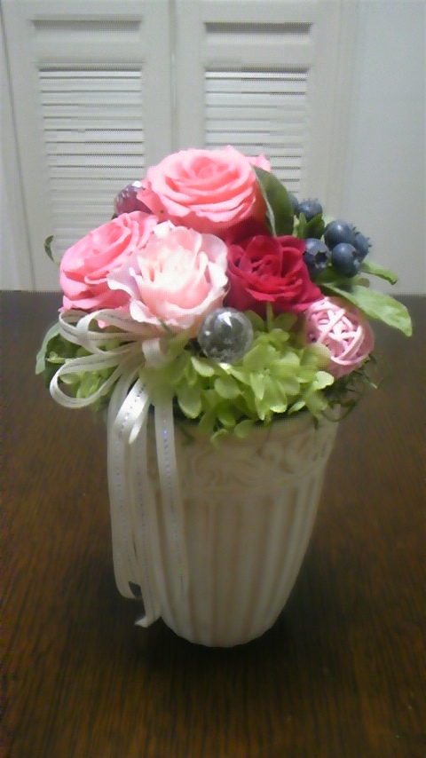 レッスンに使用した花器があったので、先日と似たアレンジにしてみました。やっぱり、可愛いです~。p(^^)q