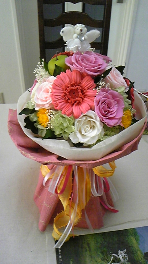 5月に行われるバレー発表会で5才の女の子に渡すブーケです。天使のくまピックを挿してみました。きっと喜んでくれる事でしょうp(^^)q 発表会、楽しみですね。