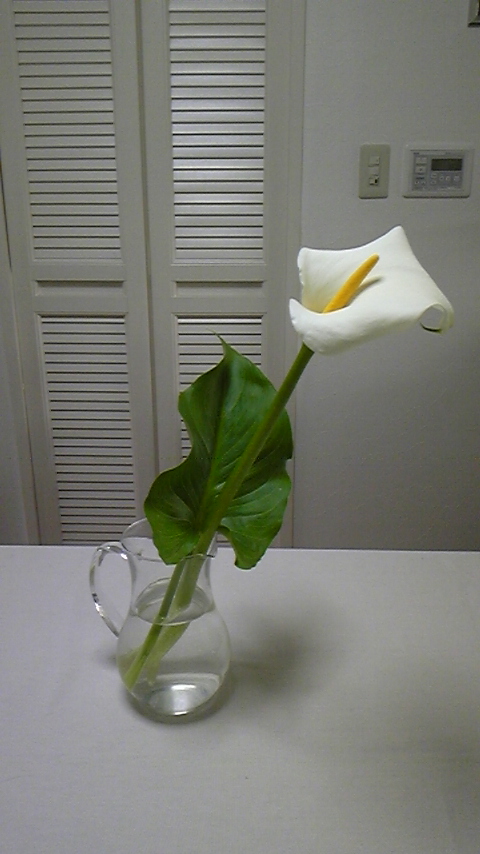 この季節になると庭のすみにこんな大きなカラーが咲きます。お部屋で楽しんでます。見る度にうっとり(^_^)