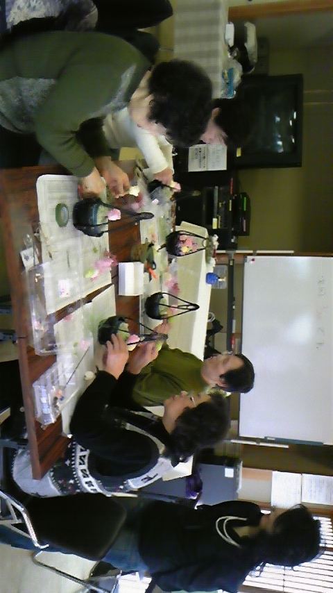 例により、デモンストレーションで挿し方だけ参考に見て頂きます。この時もキンチョーするほど集中して見て頂いてます(^^ゞ まずはメインのピンクのバラから