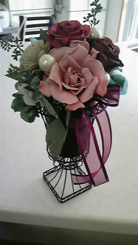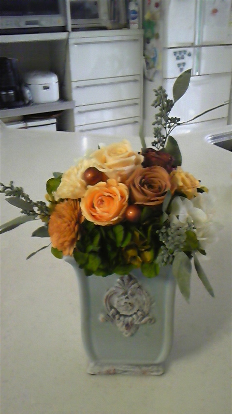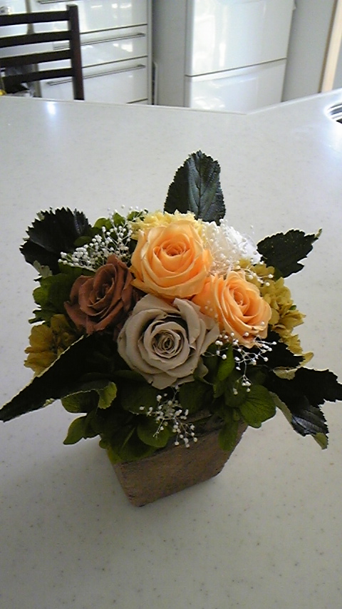 こちらは先程の退職祝いの花を贈られた方(母のご近所で80過ぎのご婦人)に以前に茶系の色を希望でアレンジさせて頂いたものです。毎日眺めて喜んで頂いているようで、嬉しいです。
