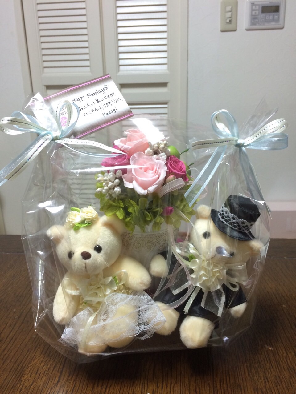 プリザーブドアレンジとくまちゃんのペアを一緒にプレゼントでラッピングしたらこんなに可愛くなりました。(^○^)