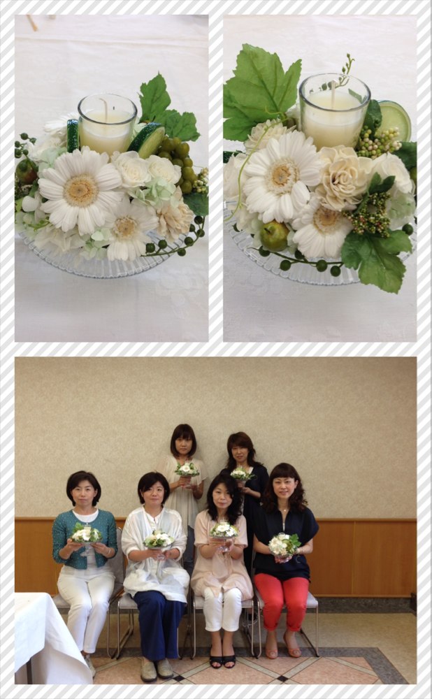 今日は夏らしい爽やかな色合いとワイヤーでチョウを作ってアレンジしてみました。以前作ったアレンジの器のみ持って来て頂いて、おひとりの方はリメイクしました。