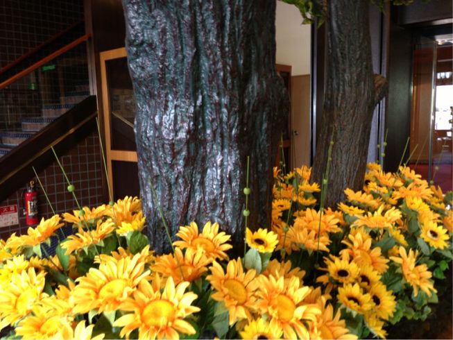 喫茶にある大きな木の下をひまわりで、夏のアレンジにしてみました。