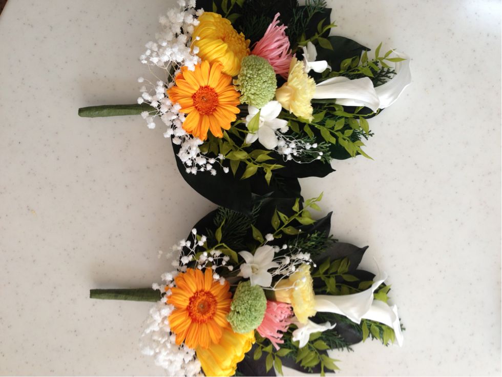 今回は以前作ったアレンジのリメイクです。花器の再利用で雰囲気をガラリと変えてみました。ホワイトカラーからビタミンカラーに。