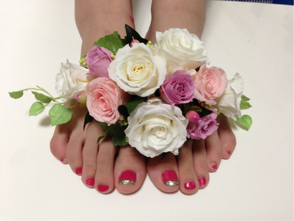 ネイリストのKちゃんからフットネイル撮影のお花が欲しいとご注文頂きました。「両足ではさんで小指から小指までの細長い菱形のお花」とメールに書かれてました。イメージはすぐにわかりましたが、フットネイルの為のお花は初めて作るので、ネイルを引き立てるさりげない美しさを表現するのに試行錯誤しました。アップになるのでバランスが難しかったです。