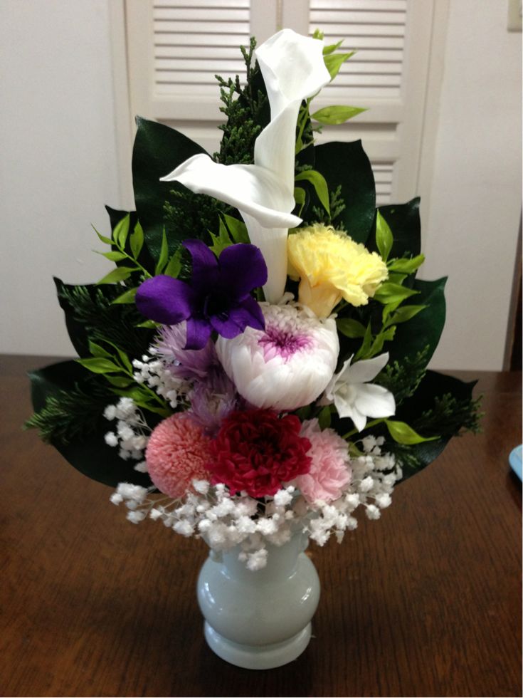 仏花を作らせれば右に出るものはいないと自負するお姑さんのアドバイスを受けて作ってみたら、いつもより全体のバランスが良くなりました。