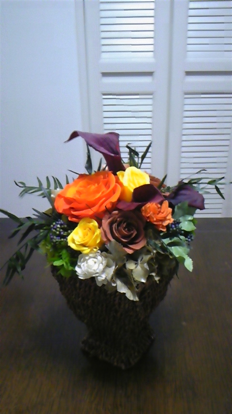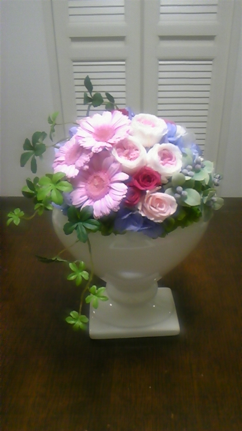 以前、白い花器を持参頂きリメイクしたいとご要望。明るい色でアレンジしました。