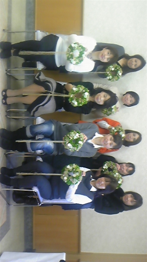 先日、奈良パークホテル様の高円の間にてプリザーブドフラワー教室を開催しました。グリーンを基調にキラキラ光るものでクリスマスの感じを出しました。金色のガーランドがオシャレです。同じ材料でもみんなそれぞれ配置に工夫を凝らして素敵なリースが出来上がりました。