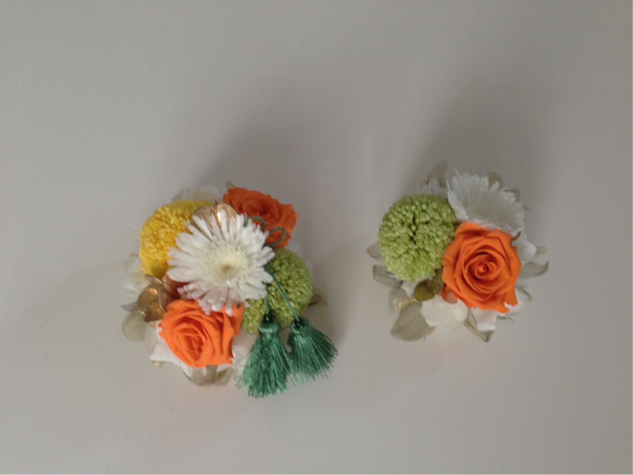成人式のお着物に合わせてプリザーブドフラワーで和風に作りました。左右に付けるので大小でデザインしてみました。タッセルも付けて可愛くなりました。
