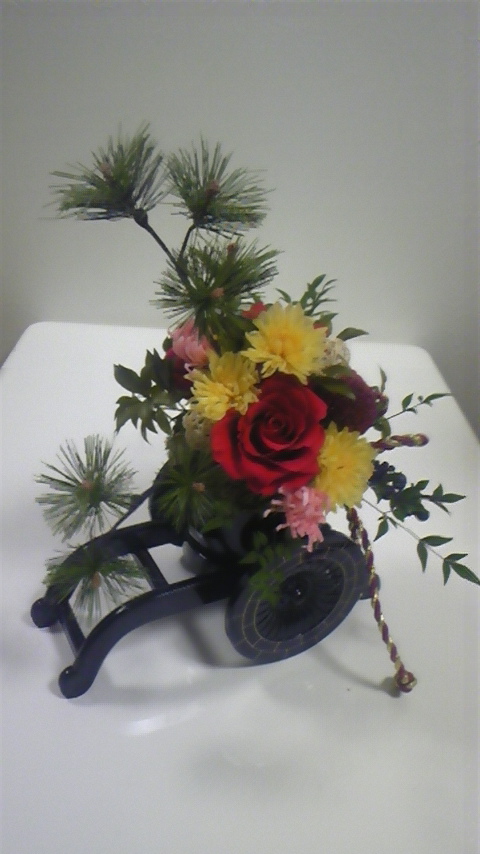 いつもご注文頂くK様からプレゼント用に一月らしいアレンジのご依頼がありました。銀の模様の器に紅白とピンクと金でスッキリと仕上げました。