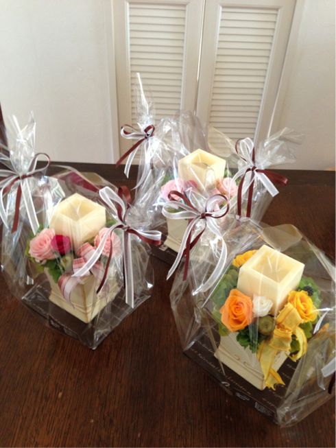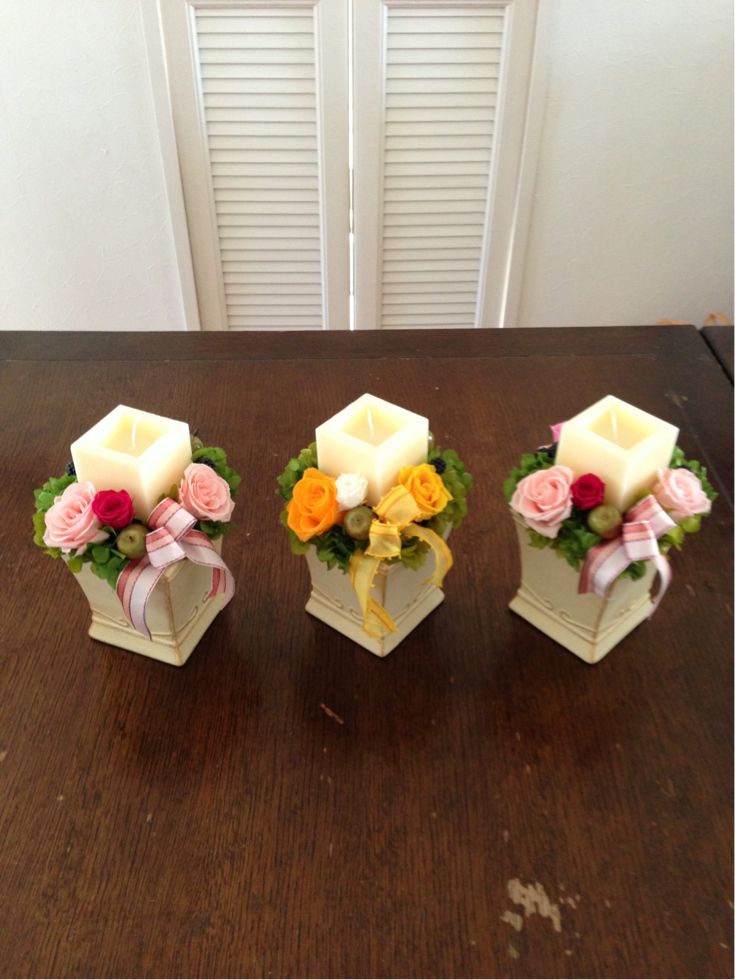 三つご注文を頂きました。春らしい色でアレンジ。このキャンドルはまわりは溶けず、中心部分だけとけて、安全です。多分、キャンドルは灯さないと思いますが。(^ν^)