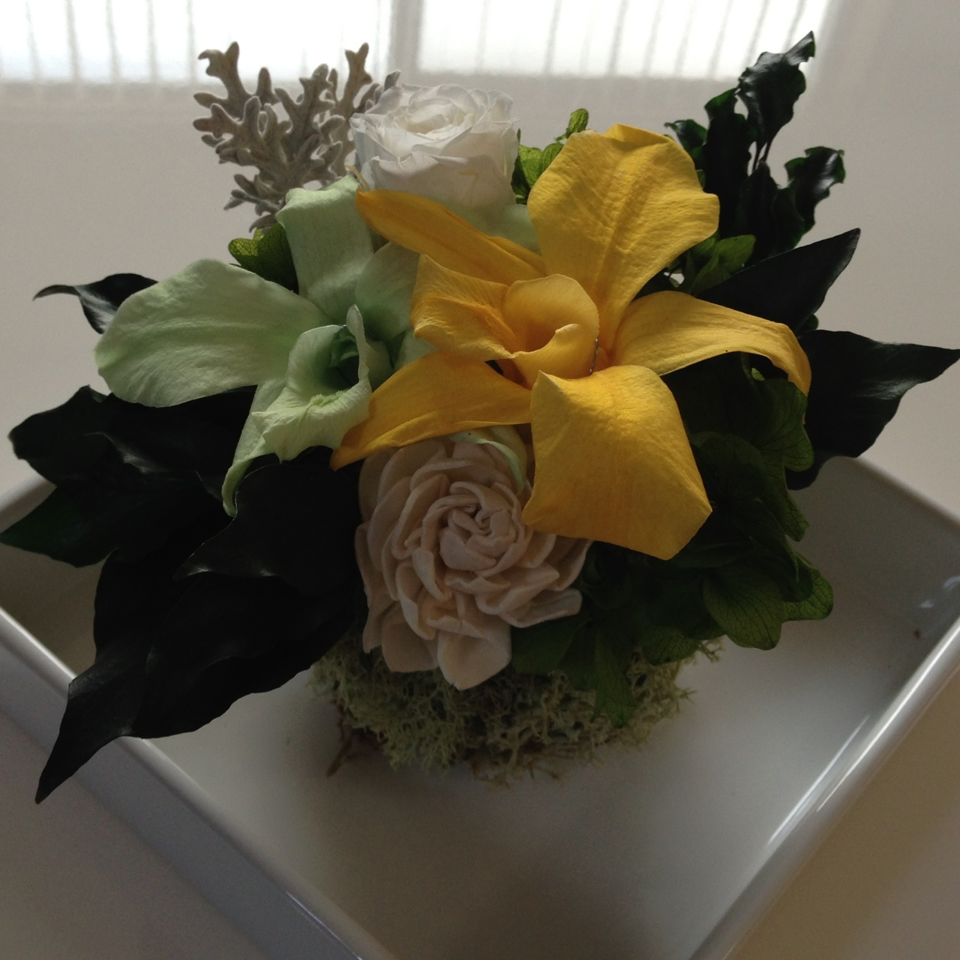 苔玉アレンジです。最近、NHKでも取り上げられていましたね。本物の苔玉は育てるのが難しいのですが、プリザーブドフラワーならいつまでも瑞々しくお世話要らずです。p(^_^)q