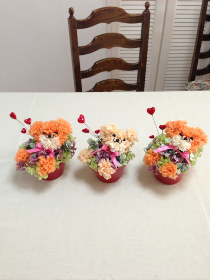 母の日のカーネーションで、くまちゃん@ 'ェ' @のアレンジにチャレンジ。皆様は戴く側なんですが^_^; 楽しんで下さい。